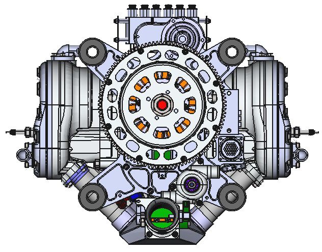 The engine with integrated alternator, water pump, oil pump and electric starter.